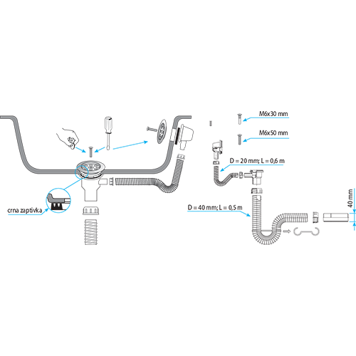 - adapter prečnika 40mm za kanalizacionu cev 50mm ili adapter prečnika 29/30mm za olovnu odvodnu cev 5/4”.