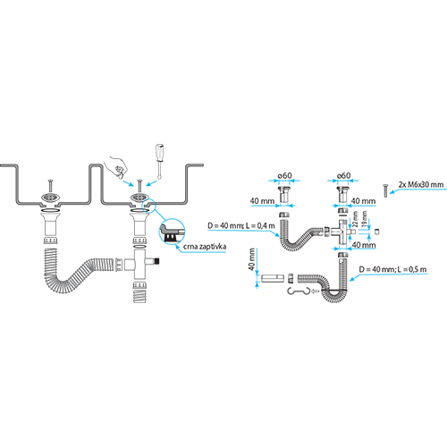 - adapter prečnika 40mm za kanalizacionu cev 50mm ili adapter prečnika 29/32mm za olovnu odvodnu cev 5/4”